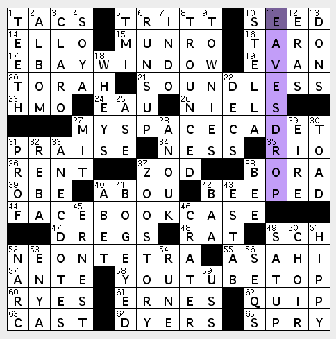 Thought the clues for the theme answers were terrible, except for MYSPACE CADET. With this one, the clue plays off "space cadet" so that works. I suppose EBAY WINDOW is not so bad either. But FACEBOOKCASE and YOUTUBETOP, there was just nothing keying off the compound word. Boo! Hiss!
