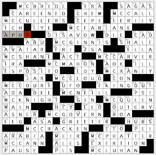 Cute idea for a theme. Not crazy about the theme answers chosen though. PETTY CASH is awesome and MIX AND MATCH is good, but the other two? CRUISE CONTROL would have been a better choice (believe me, I know sometimes you have to settle because you can't find a matching entry, so maybe it wasn't possible, but I'm just sayin'). And HANKS OF HAIR is downright ugly. Do you guys remember that puzzle Doug and I made with the clues "good place for a run" and "bad place for a run"? Doug suggested PAIR OF PANTYHOSE for one of the theme answers. I vetoed that one right off the bat. HANKS OF HAIR reminds me of that. Only worse. And there are other Toms that might have worked better than Hanks: Tom Waits, Tom DeLay, Tom Brady.Lots of people in the grid today. I actually like seeing people in my grid, but I'm sure some will complaing about it. Here's who showed up today: